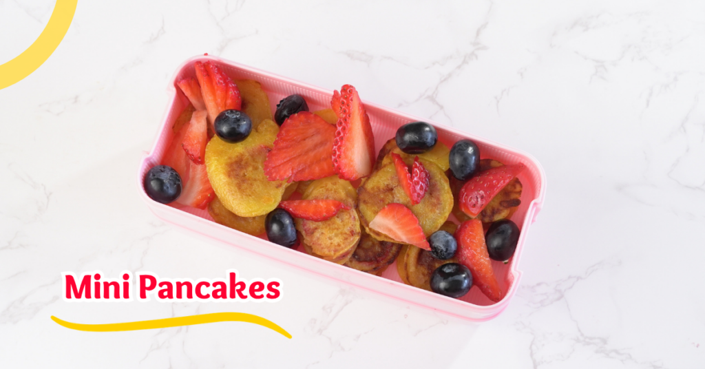 - Ah! y vamos a acompañar nuestros mini pancakes con arándanos y fresas. ¡Es hora de comer la lonchera!
